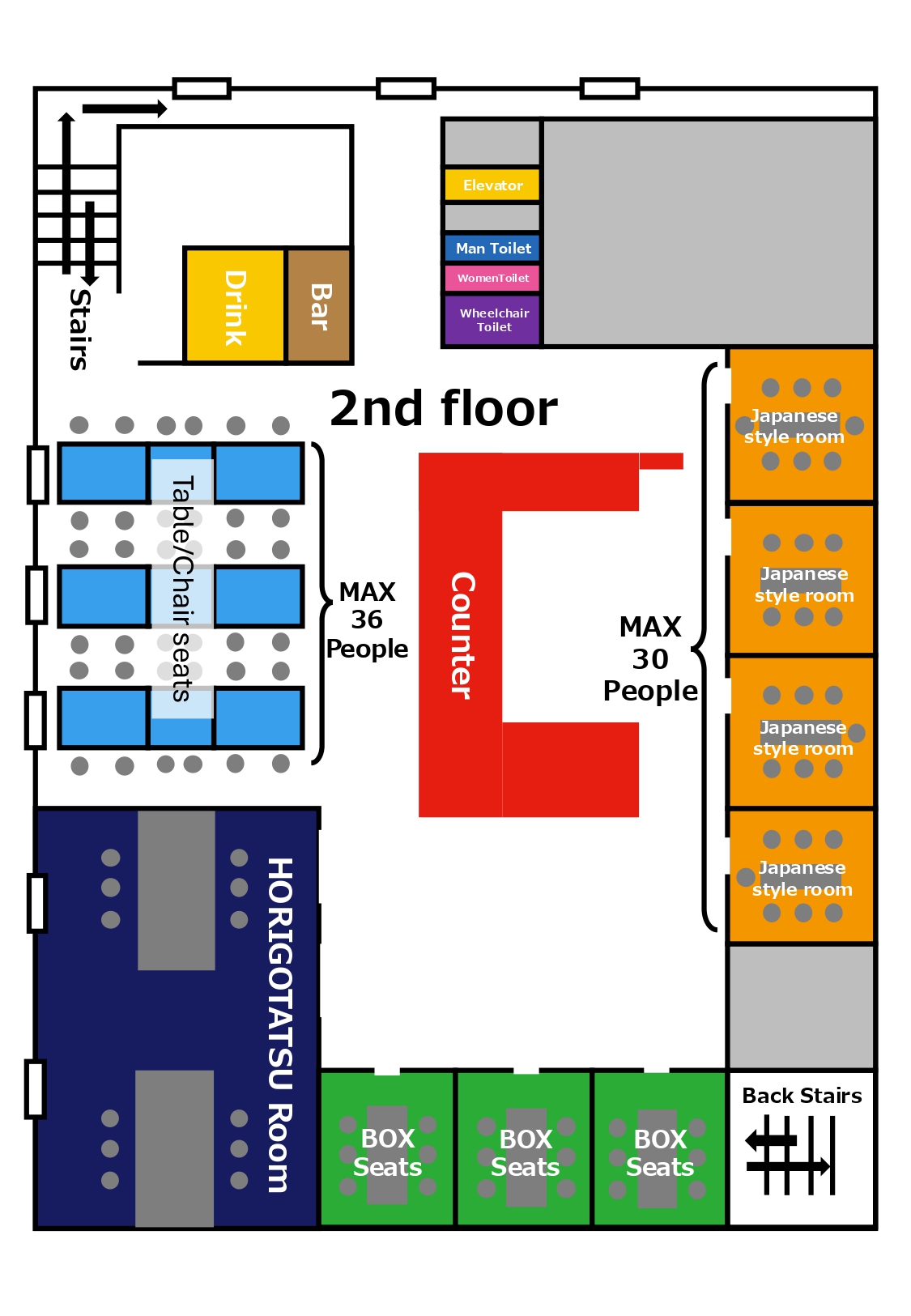 | Upstairs seat | Counter seats (up to 11 people), box seats (3 boxes x 6 people), bar counter (8 seats) |